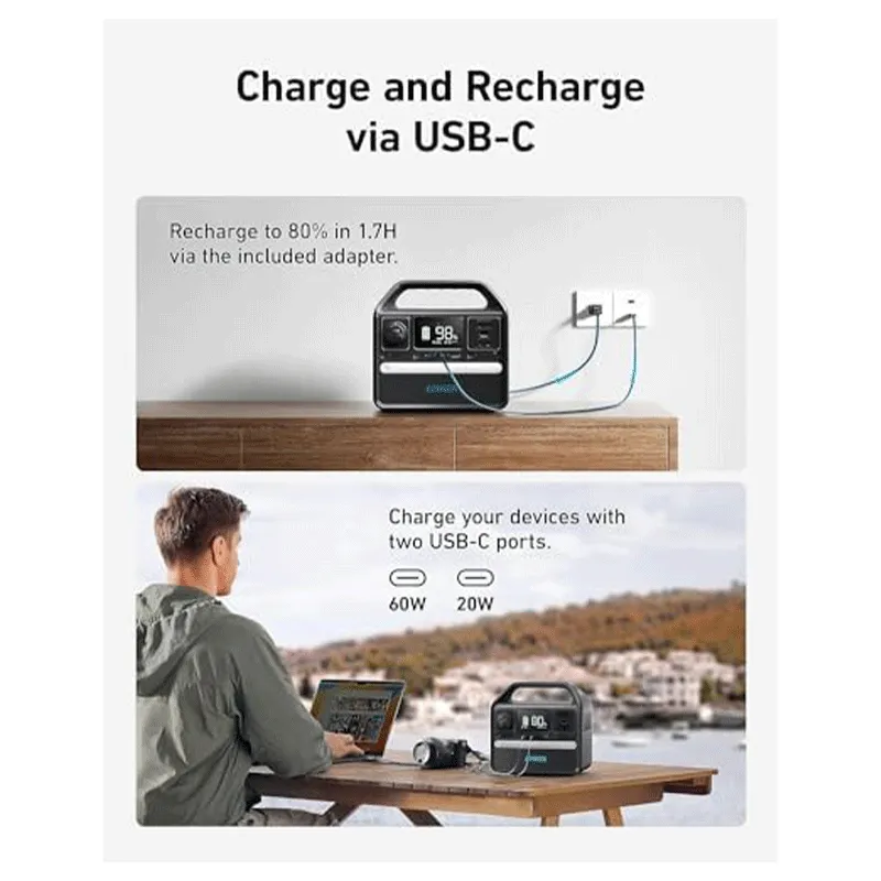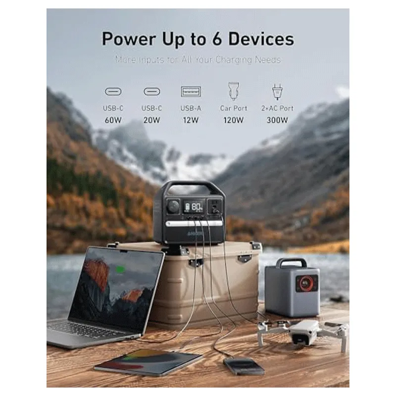 Anker 522 Portable Power Station features 2 AC ports, 2 USB-C ports, a USB-A port, and a car outlet. Plug in up to 6 devices at once and charge anywhere.