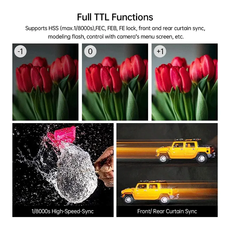 Compatible with Canon’s TTL system, it delivers accurate and automatic flash exposure for various shooting scenarios. The flash also supports High-Speed Sync (HSS) up to 1/8000s, allowing you to capture fast-moving subjects or shoot in bright conditions with ease.