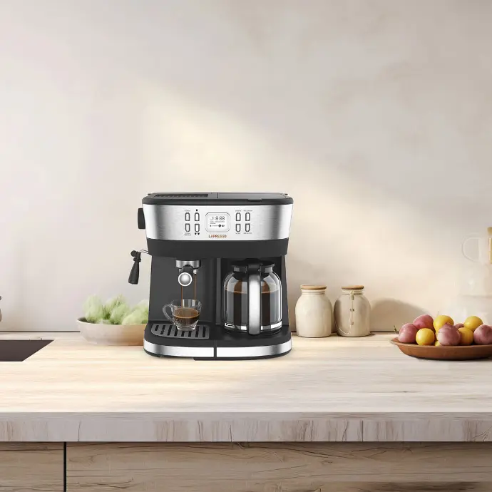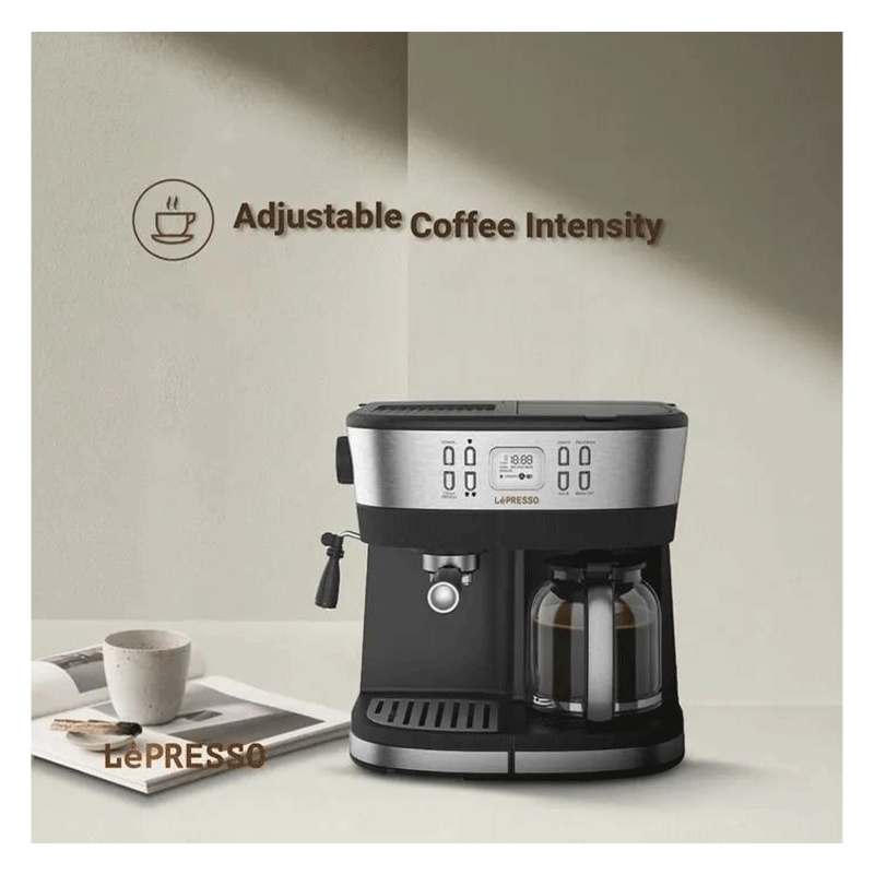 Start your day off ideally with the LePresso Dual Brew Drip Coffee & Espresso in stylish Black. This versatile coffee maker melds drip coffee convenience with espresso richness for a complete coffee brewing experience.