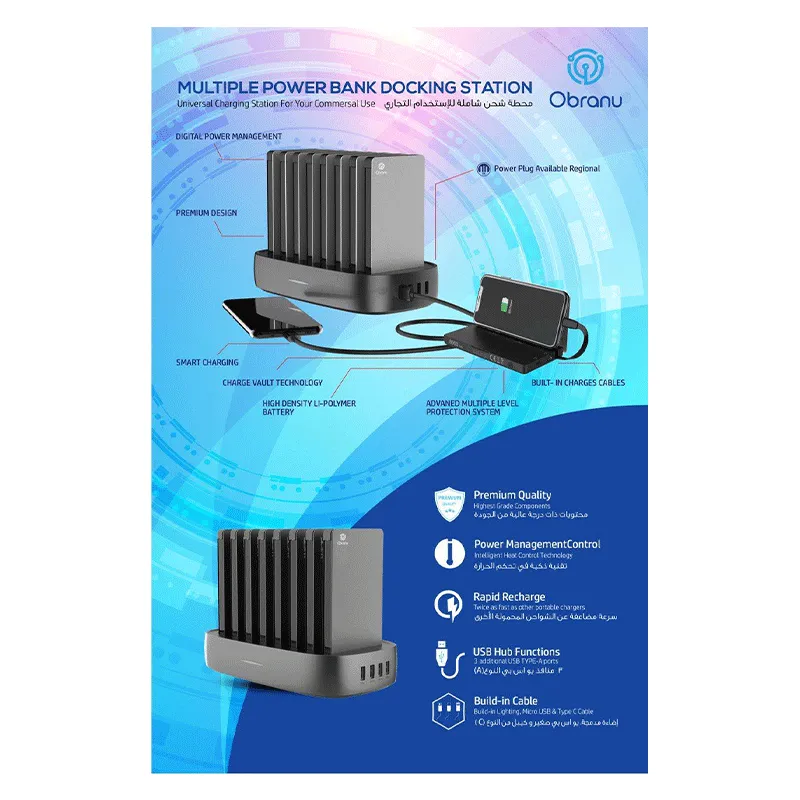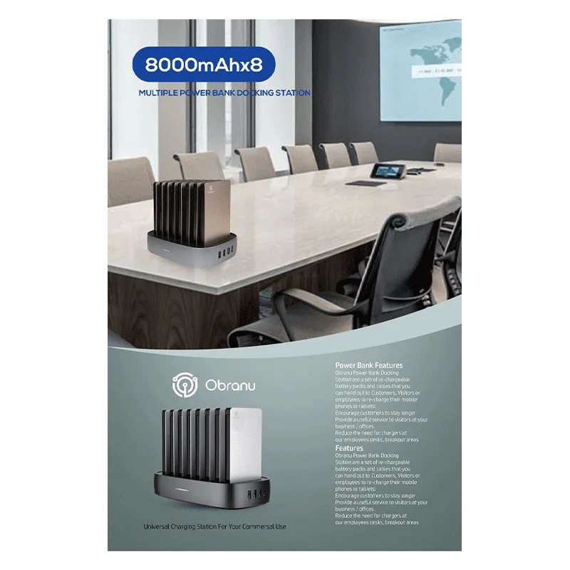 Introducing the Obranu 8000Ahx8 Multi-Device Charging Hub, a game-changing mobile power solution designed to keep you and your devices connected at all times. This innovative system features 8 individual power banks, each with a robust 8000mAh capacity, all seamlessly recharged through a single central hub. Engineered to meet the demands of modern connectivity, whether in expansive corporations, households, hotels, eateries, or diverse service establishments, this power station offers collective and individual charging functionalities, providing a versatile and efficient charging experience.